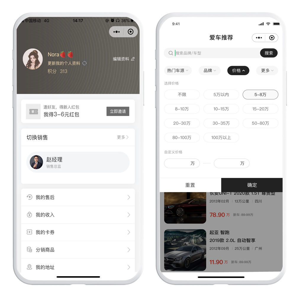 首先呢,给每一个销售一个武器,传统的汽车二手车小程序,公司无非就是提供产品的基本介绍和价格优势,其它的全部靠自己。