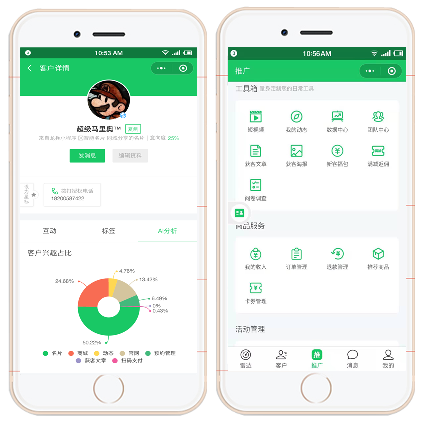 6、好交付:用户打开小程序10秒创建名片,完成交付,即可拥有智能名片、动态、获客海报、获客短视频、获客文章,雷达系统、SCRM系统,客服聊天系统。